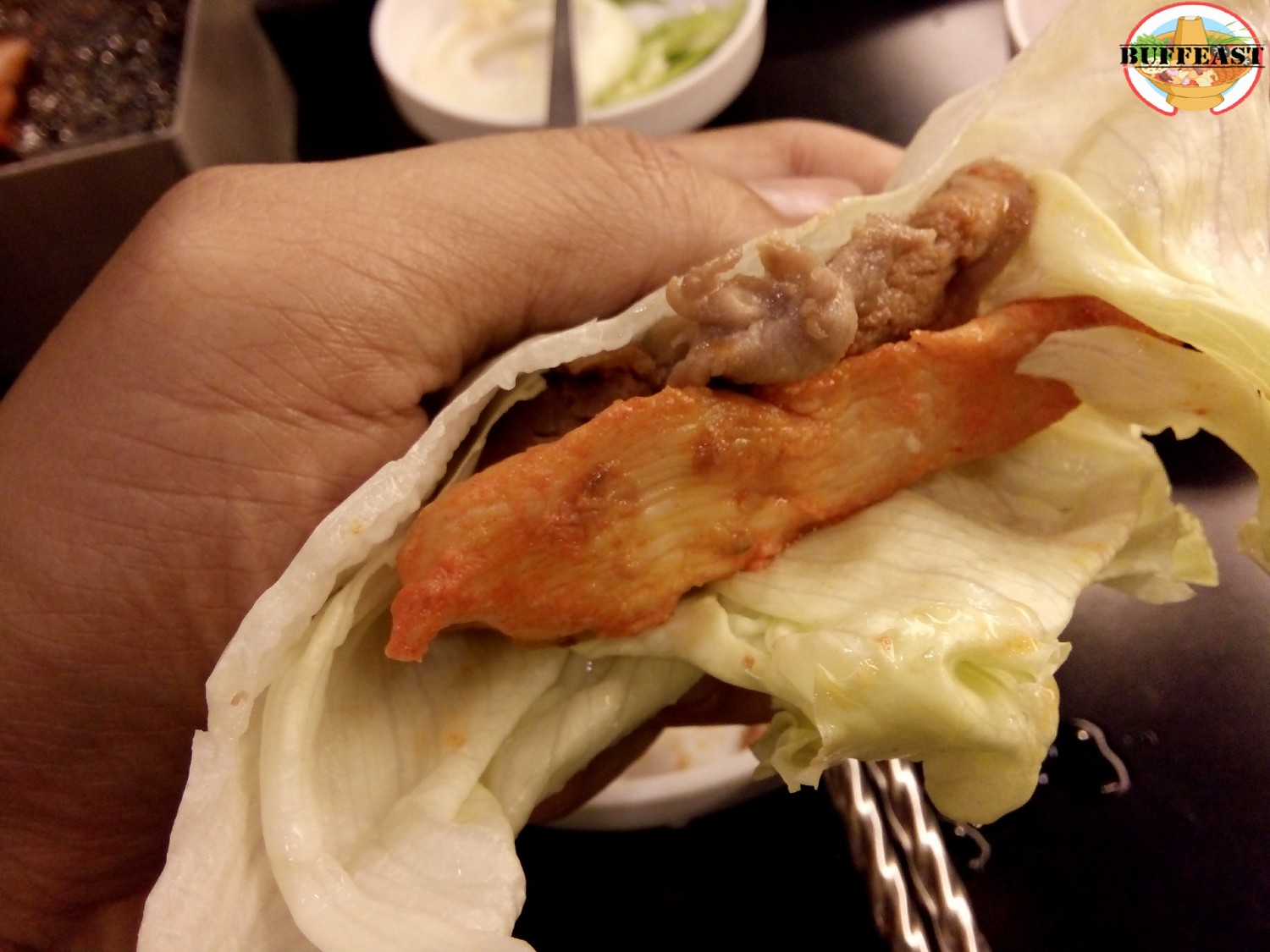 กินแบบห่อกับผักสลัดดูบ้าง ผักรสชาติไม่ค่อยโดนเท่าไหร่นะผมว่า มันเฝื่อนลิ้นแล้วก็เปราะๆยังกับกระดาษ