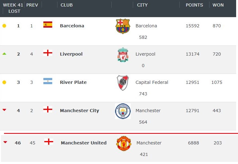 แมนเชสเตอร์ ยูไนเต็ด กำลังแสดงให้เห็นว่า เริ่มเข้าสู่ยุคตกต่ำเรื่อยๆ หลังหล่นไปเป็นสโมสรอันดับที่ 46 ของโลกแล้ว จากการจัด 50 อันดับของ ฟุตบอล เวิลด์ แรงกิ้งส์ โดยเบอร์ 1 ในเวลานี้คือ บาร์เซโลน่า ยักษ์ใหญ่ ลา ลีกา สเปน