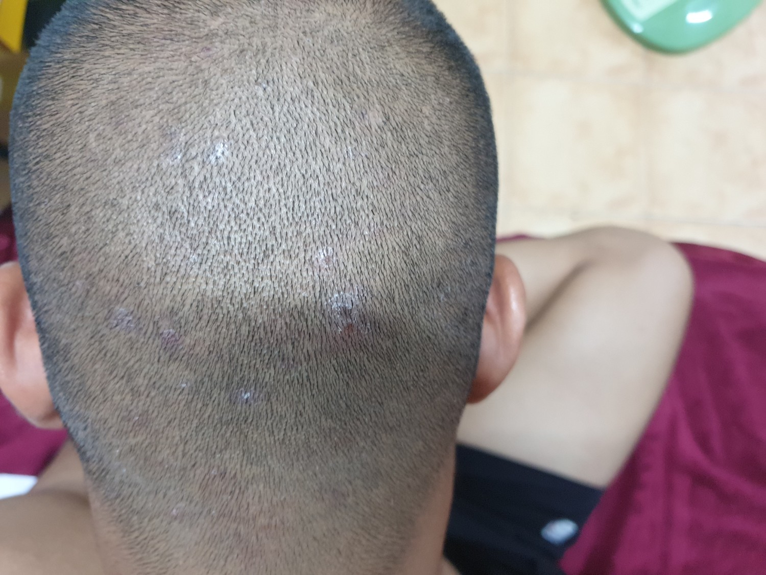 อยากทราบว่าอาการตุ่มเล็กๆขึ้นศีรษะเป็นเกล็ด มีบางตุ่มเป็นตุ่มหนอง เป็นชันนะตุรึเปล่าครับ(มีภาพ)