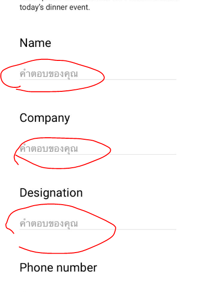 รบกวนถามผู้รู้ค่ะ เราทำฟอร์มจากคอมพิวเตอร์ปกติ ตั้งค่าภาษาเป็นภาษาอังกฤษทั้งหมด ซึ่งหากเปิดฟอร์มนี้ในคอมพิวเตอร์ ตรงช่องให้ตอบก็จะแสดงเป็นภาษาอังกฤษ - your answer- ปกติ (ตามภาพ)