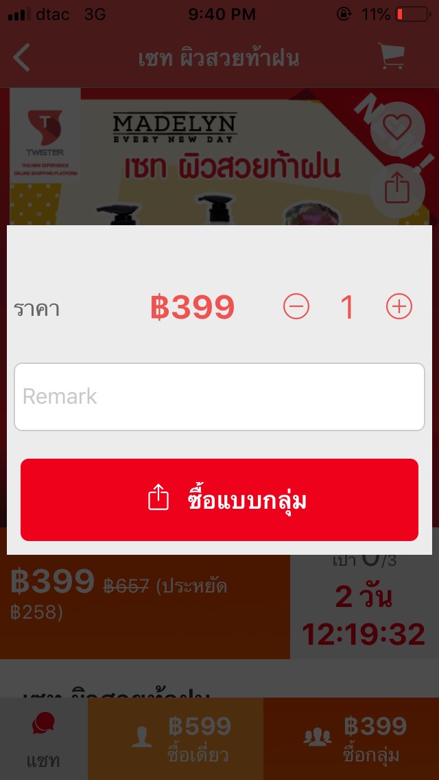 เมื่อเราแชร์แล้วทางแอพจะเด้งมาหน้าสั่งซื้อค่ะ เราสามารถเลือกได้นะคะว่าเราจะซื้อเซทนี้กี่เซท ถ้าเป็นสินค้าที่เราใช้อยู่แล้วอยากได้ราคาพิเศษโดยไม่ต้องลุ้นก็ซื้อจำนวน3ชิ้นเพื่อให้ปิดกลุ่มไปเลยก็ได้ค่ะ แต่เราซื้อชิ้นเดียวค่ะ