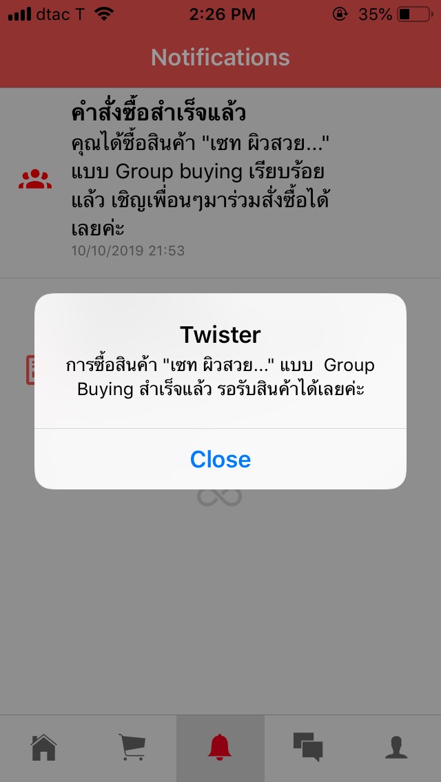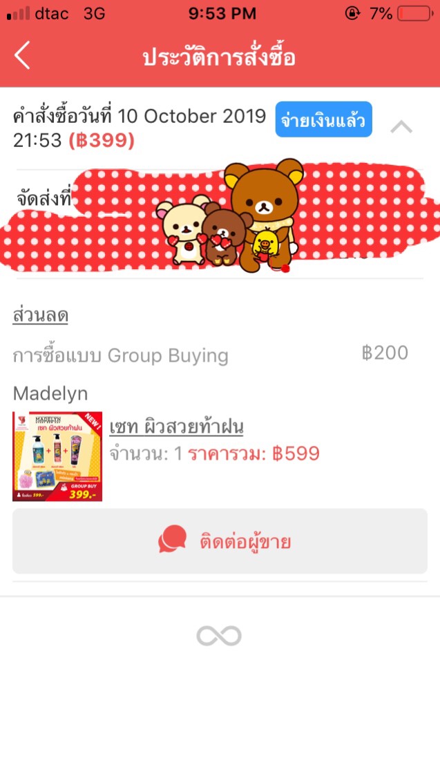 เมื่อทำการชำระเงินแล้วก็จะมีข้อความเด้งขึ้นมาค่ะ ว่าเราได้สั่งซื้อแบบGroupbuyเรียบร้อยแล้ว เชิญเพื่อนๆมาร่วมกันซื้อได้เลย