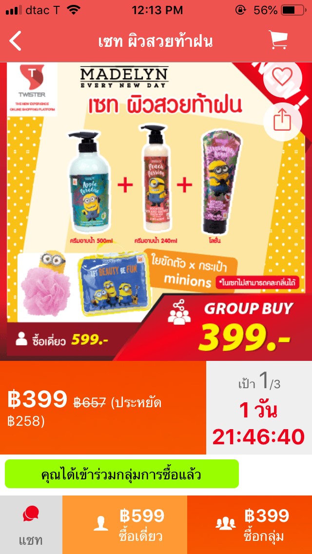 เซทนี้เลยจ้า ที่เราอยากได้ เซทครีมอาบน้ำและโลชั่นน้องมินเนี่ยนสุดน่ารัก(แพ้ความน่ารักจริงๆ) โดยในเซทนอกจากจะได้ราคาพิเศษแล้ว ยังได้ใยขัดตัวและกระเป๋าด้วย ว้าวสุดๆเลย เพื่อนๆลองสังเกตดูนะคะว่าราคาซื้อเดี่ยวจะ 599 บาท ราคาซื้อกลุ่มจะ399บาท ลดตั้ง200บาทแหนะ โดยเงื่อนไขคือ 0/3 ต้องมีคนมาซื้อของชิ้นนี้จำนวน3คนนะคะ และมีระยะเวลา2วันเพื่อรอให้คนมาสั่งซื้อค่ะ ถ้าการสั่งซื้อไม่สำเร็จกลุ่มก็จะปิดไป การสั่งซื้อไม่สำเร็จก็จะได้เงินคืนค่ะ แต่ถ้าสำเร็จก็รับไปเลย ราคาสุดพิเศษ !