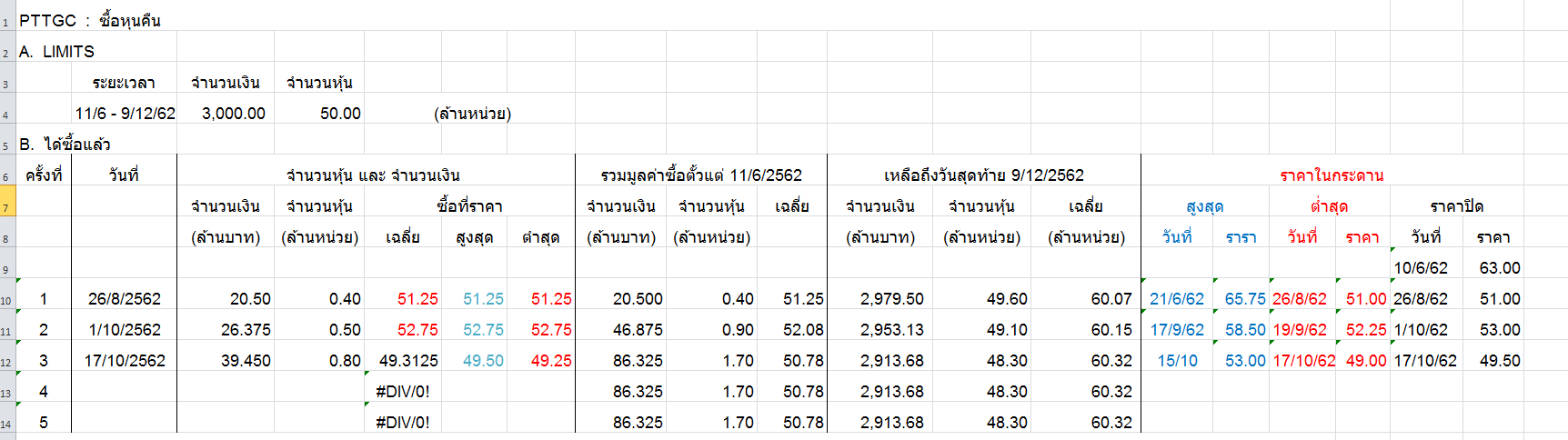 เวลาผ่านไป 4 ดือนกับไม่กี่วัน (16/6/62 - 17/6/62) จากเป้า 50.00 ล้านหน่วย บริษัทได้ซื้อคืนเพียง 1.70 ล้านหน่วย หรือ 3.4% ของเป้า 50 ล้านหน่วย ต้องติดตามเวลาผ่านไป 4 เดือนกับไม่กี่วีน (16/6/62 - 17/10/62) จากจำนวนเป้า 50.00 ล้านหน่วย บริษัทได้ซื้อคืนน้อยมากเพียง 1.70 ล้านหน่วย หรือ 3/4% ของเป้า 50.00 ล้านหน่วย ไม่เท่านั้นได้เข้าซื้อเมื่อราคาหุ้นต่ำๆ ส่งผลราคาในกระดานไหลลงมาตั้งแต่ 16/6 ถึงทุกวันนี้ (17/10/2562)