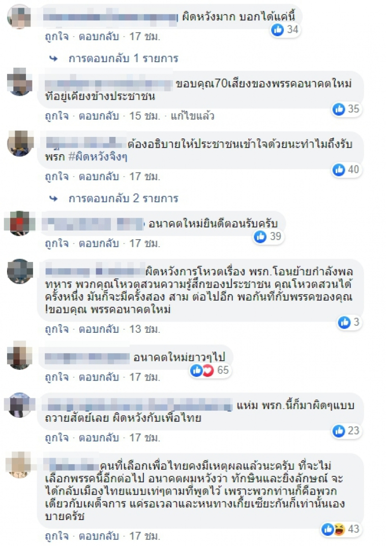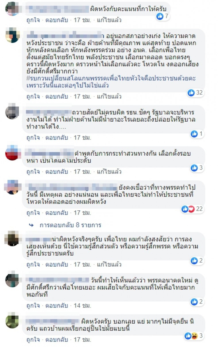 ผู้ใช้เฟซบุ๊กซึ่งสนับสนุนพรรคเพื่อไทยส่วนใหญ่ แสดงความคิดเห็นผิดหวังกับมติของพรรคเพื่อไทยดังกล่าว ดังนี้