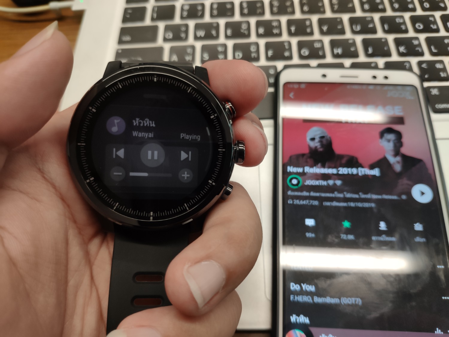 นึกไปนึกมา เห้ย! ที่แขนเรามา Amazefit stratos นี่นา แล้วตัวนี้มันสามารถเชื่อมต่อกับมือถือได้ มีโปรแกรมเล่นเพลงด้วย งั้นก็ใช้ตัวนี้เลยดีกว่า ของใกล้ตัวแท้ ๆ