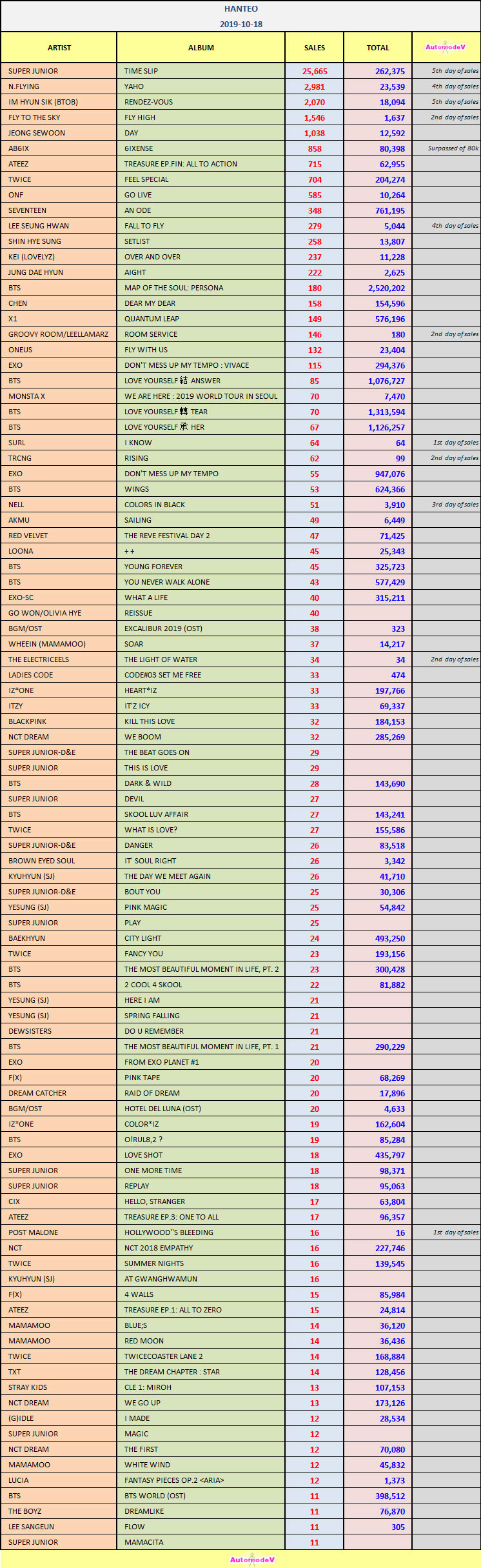 ยอดซื้ออัลบั้มจากชาร์ต HANTEO 18 ตุลาคม 2562