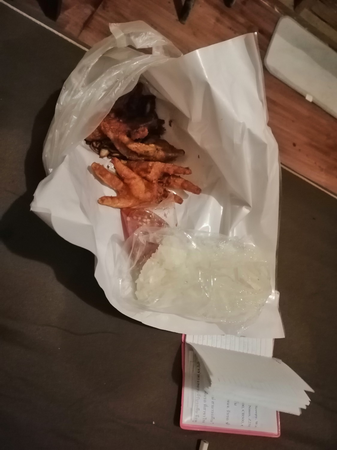 ขากลับก็แวะซื้อไก่ทอดหน้าเซเว่นบ้านพุน้อยก่อนถึงบ้านพุใหญ่ที่เราพักนิดเดียว นั่งกินบนเตียงเล้ย หมดแรงจริงๆ กินไปจดไดอารี่ท่องเที่ยวไป