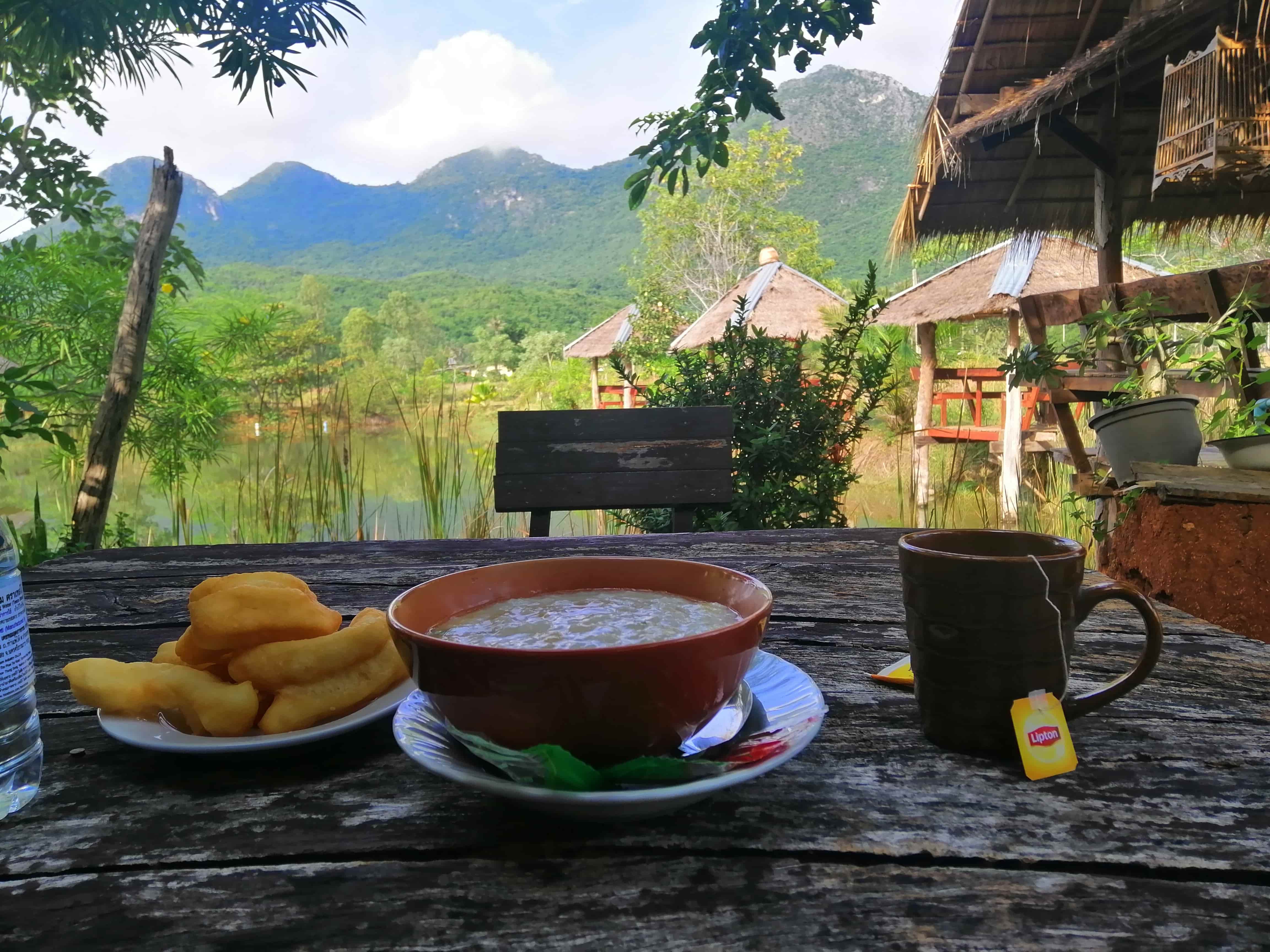 กลับมาโฮมสเตย์พี่เขาก็เตรียมอาหารเช้าให้เลย เป็นโจ้กหมูกับปาท่องโก๋ ส่วนชากาแฟเติมได้ไม่อั้น