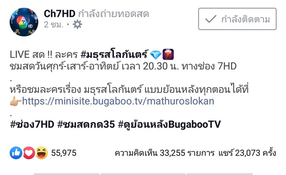 "มธุรสโลกันตร์" ทำลายสถิติ FB Live แซง "สองนรี" ด้วยยอด 1.5 แสน และยอดดูย้อนหลังรวม 22.4 ล้าน เพิ่มเกือบ 12 ล้านใน 5วัน
