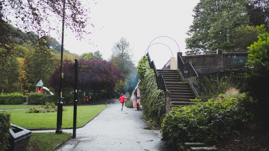 เที่ยงกว่าๆ หลังวางแพลนเสร็จเราก็เดินออกมาจากสถานีกัน ซึ่งวันที่ไปเนี่ย ฝนตกทั้งวันเลย ฟ้าก็จะครึมๆ พื้นจะแฉะๆ หน่อยๆ ที่แรกที่พวกเราไปคือ Calder Holmes Park เป็นสวนสาธารณะที่ชาวเมืองพาหมามาเดินเล่นกันค่ะ ซึ่งเมืองนี้หมาเยอะมากกก เยอะกว่าที่ Manchester เยอะเลย ไม่รู้ว่าเพราะวันที่เราไปเป็นวันอาทิตย์หรือเปล่า คนเลยพาหมามาเดินเที่ยวกันเพียบเลย ซึ่งที่นี่ส่วนใหญ่ไม่ใช้สายจูงนะคะ ปล่อยฟรีเลย
