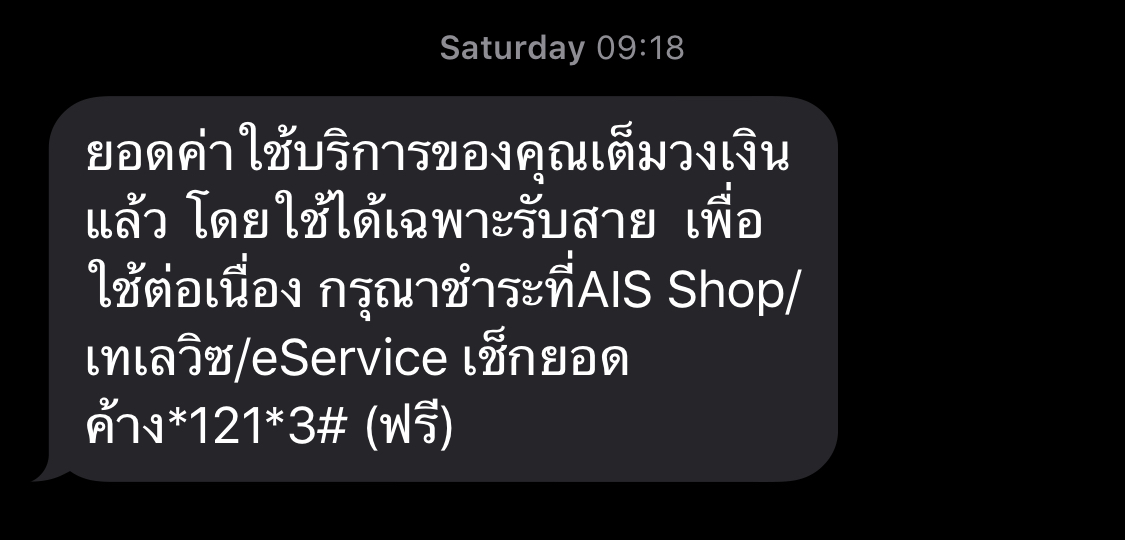 จนกระทั่งเมื่อวันเสาร์ที่ 19 ตุลาคม 2562 ผมก็ได้รับ SMS จาก AIS ตามรูปด้างล่าง
