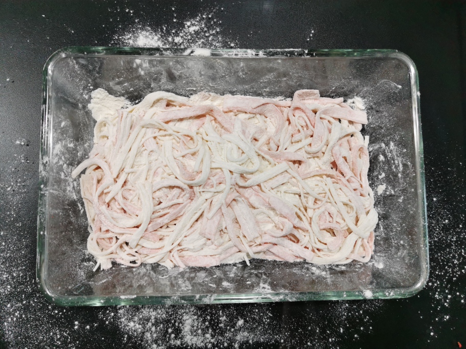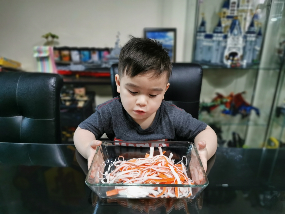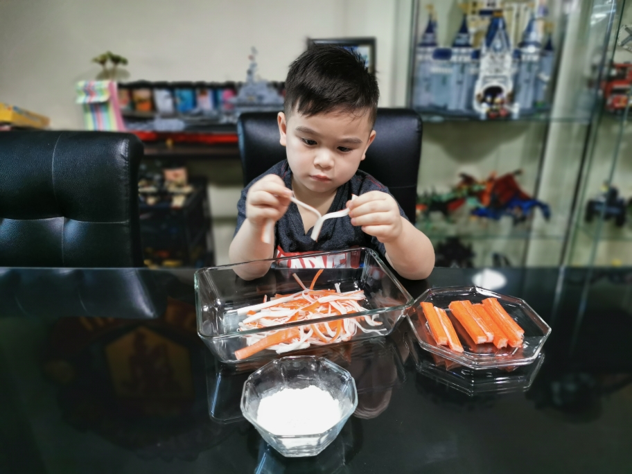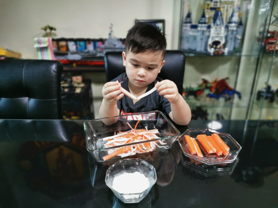 เริ่มด้วยให้ลูกชายช่วยฉีกปูอัดออกเป็นเส้นๆครับ