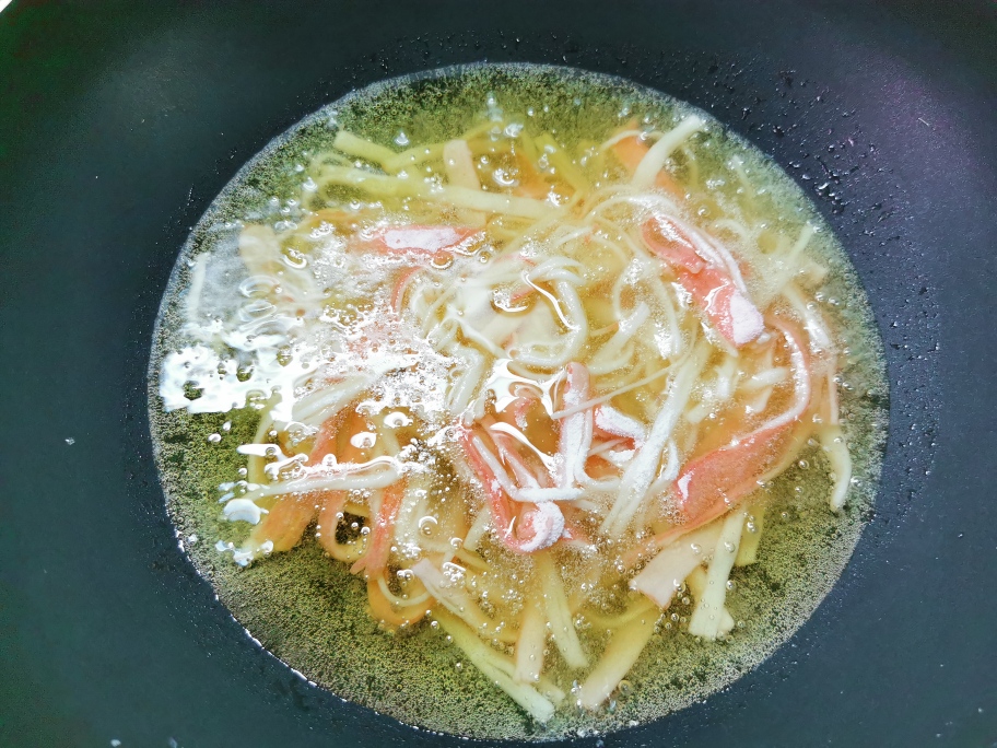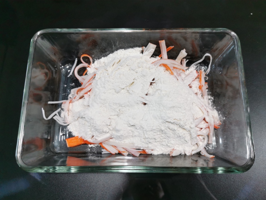 ใส่แป้งทอดกรอบและคลุกแป้งกับปูอัดให้เข้ากันครับ