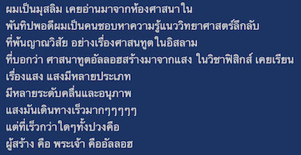 สร้าง ศาสนทูตจาก "แสง" ว่าอยู่ใน ซูเราะห์ใด และ อายะห์ใด ถ้าคุณอ้างอิงมาได้เราจะได้ คุยต่อไป