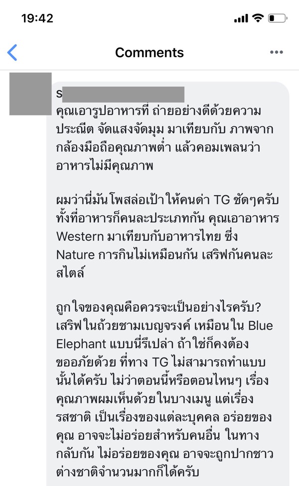 สเตตัสนี้คงมีผู้ผ่านมาชมเป็นจำนวนมาก และทำให้คุณ S ซึ่งบอกว่าตัวเองเป็นหนึ่งในผู้ให้บริการในอาหารชั้นธุรกิจไม่พอใจ ออกมาให้ความเห็นโต้ตอบกับผม สุดท้ายคงจนด้วยเหตุผล เลยเกิดประโยคที่ว่า “ ครับ ให้คนอ่านเขา คิดเองละกันครับ คนบางประเภท พูดไปเหมือนสีซอ “