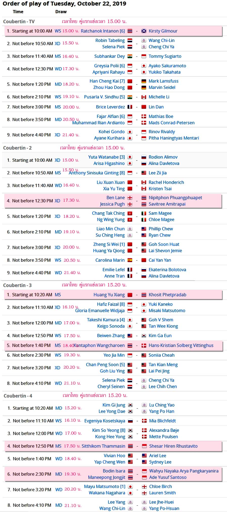• Youtube BWF ถ่ายทอดสด รอบ 16 - รอบชิงชนะเลิศ (24-27 ต.ค. 62)