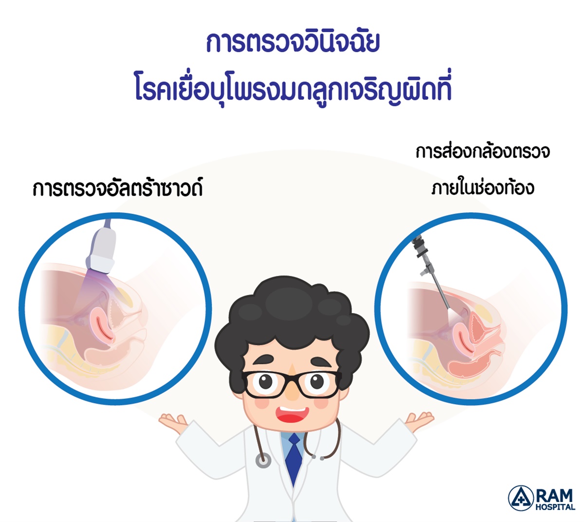 การตรวจวินิจฉัยโรคเยื่อบุโพรงมดลูกเจริญผิดที่แพทย์จะทำการซักถามประวัติความเจ็บป่วย รวมทั้งการตรวจร่างกาย ตรวจภายในร่วมกับการตรวจอัลตร้าซาวด์ เพื่อใช้ประกอบการวินิจฉัยโรคนี้ นอกจากนี้การส่องกล้องตรวจภายในช่องท้อง และตัดชิ้นเนื้อเพื่อส่งตรวจทางพยาธิวิทยา ถือเป็นมาตรฐานในการตรวจวินิจโรคนี้ และสามารถบอกความรุนแรงของโรคได้ โดยแพทย์จะเป็นผู้ให้คำแนะนำว่าผู้ป่วยรายใดที่มีความจำเป็นและเหมาะสมที่จะรับการตรวจรักษาด้วยวิธีนี้ รวมทั้งพิจารณาถึงข้อควรระวังและภาวะแทรกซ้อนต่างๆ ที่อาจเกิดขึ้นได้