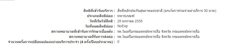 แฟนเกณฑ์ทหารครบมาหลายปีแล้วค่ะ พอดีจะพาแฟนไป รพ. เลยมานั่งเช็คสิทธิดู ปรากฏว่าขึ้นมาแบบนี้อะคะ มีคำว่า NoExp ด้วย เข้าใจว่าหมายความว่าไม่มีวันหมดอายุ เลยอยากสอบถามว่าสิทธิ์นี้ใช้ได้ตลอดชีวิตเลยใช่มั้ยค่ะ คือถ้าจะใช้สิทธิก็ต้องเข้า รพ.ในเครือกรมแพทย์ทหารเรือ เท่านั้นใช่มั้ยค่ะ แล้วจังหวัดไหนบ้างค่ะ