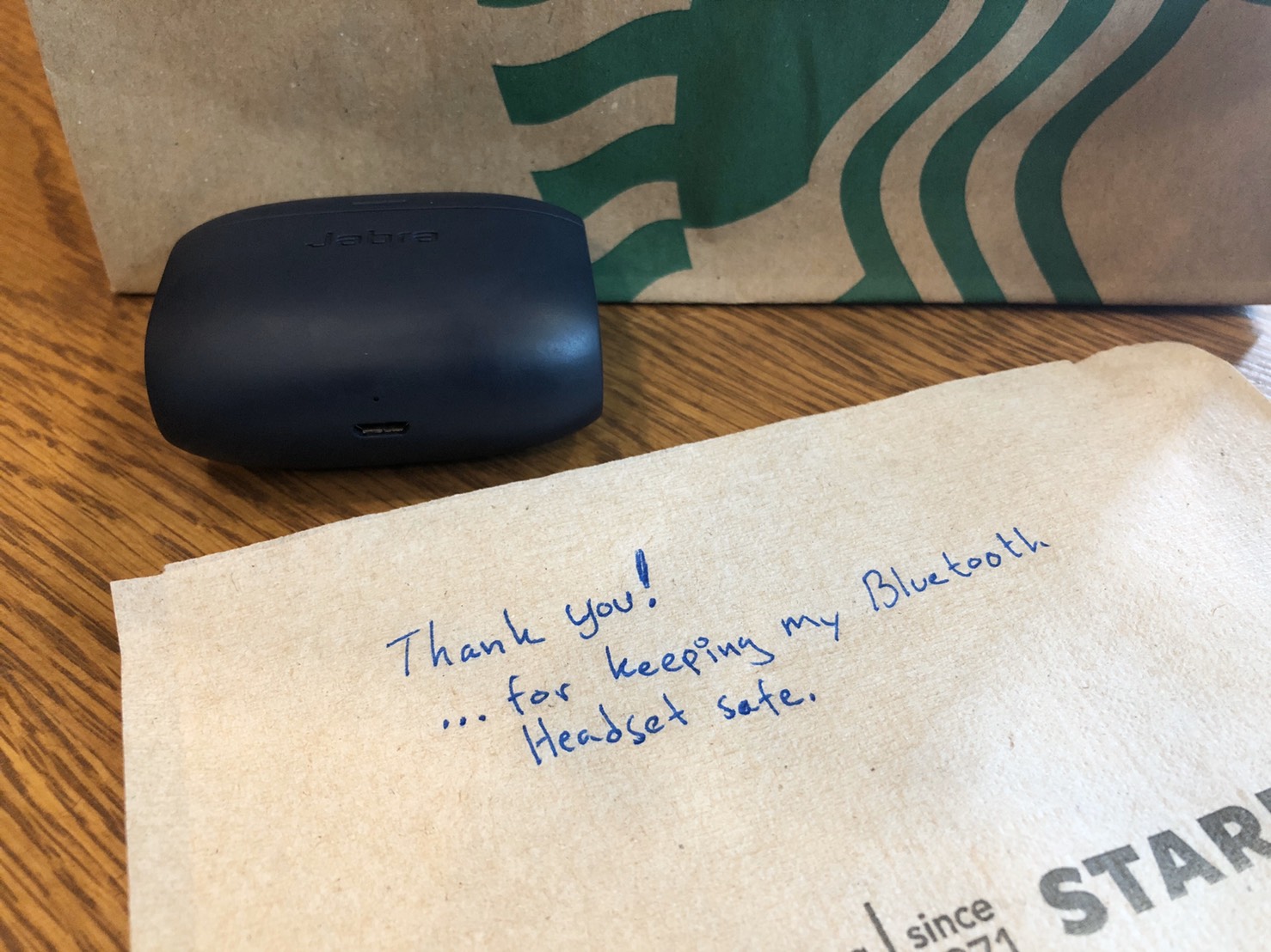 หลังจากที่ดีใจกันเสร็จและตั้งสติกันได้แล้ว เลยพิมพ์ถามแฟนว่า เธอจะให้รางวัลอะไรกับพนักงานในฐานะที่เขาทำความดี แฟนก็เลยบอกว่าคิดไว้แล้วว่าจะทำอะไร ซึ่งแผนของเขาคือให้ทิปกับพนักงานทุกคน แต่เราก็บอกว่านอกจากให้ทิปแล้วเขียนโน๊ตเพื่อขอบคุณคนที่เก็บของไว้ให้ด้วยดีมั๊ย ซึ่งเราเองก็ไม่รู้เหมือนกันว่าเมื่อวานนี้พนักงานคนใหนที่เป็นคนเก็บของให้ ถือว่าโชคดีเหลือเกิน เพราะถ้าเป็นลูกค้าด้วยกันมาเจอเราอาจจะไม่ได้ของคืนก็เป็นได้ ณ.ตอนนั้นไม่มีกระดาษโน๊ตเลยต้องใช้วิธีเขียนขอบคุณลงบนกระดาษทิชชู่ Starbucks นั่นแหละเพื่อที่จะฝากไปกับ พนง.คนใดคนหนึ่งพร้อมกับสินน้ำใจที่แนบไปด้วยหลังกระดาษทิชชู่ ( ไม่ได้กระแดะเขียนอังกฤษนะคะ พอดีแฟนเขียนภาษาไทยไม่เป็น )