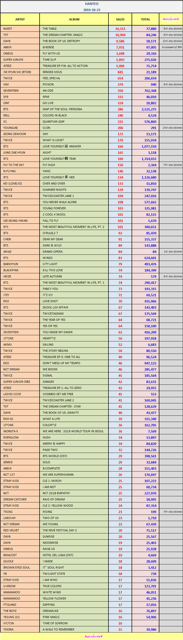 ยอดซื้ออัลบั้มจากชาร์ต HANTEO 23 ตุลาคม 2562