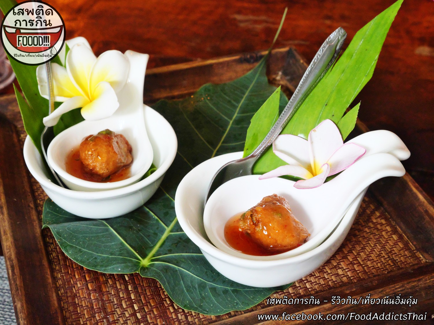 ตาม Concept ของทางร้านก็ต้องมีเวลคัมดริ้งค์มาต้อนรับเราอย่างเช่นเคย วันนี้เป็นน้ำสับปะรดที่มีรสเปรี้ยวและหอมเหมือนมีกลิ่นดอกไม้เย็นสดชื่น มาพร้อมกับผ้าเย็นผืนใหญ่ช่วยลดความร้อนจากการตากแดดพัทยาอันร้อนแรงลงได้อย่างรวดเร็ว ตามมาด้วยอาหารทานเล่นวันนี้ทางร้านเสิร์ฟเป็น ทอดมันปลาราดด้วยซอสพร้อมทานทอดมันปลาสัมผัสเหนียวหนึบ หอมกลิ่นเครื่องแกงกับซอสรสหวานเปรี้ยวอร่อยดีครับ ถ้าใครติดใจก็สามารถสั่งมาทานได้ มีอยู่ในเมนูหลักของทางร้าน โดยเมนูทานเล่นนี้จะมีการสุ่มเสิร์ฟทุกวัน ต้องลุ้นเอาครับว่าวันนี้จะได้ชิมอะไร