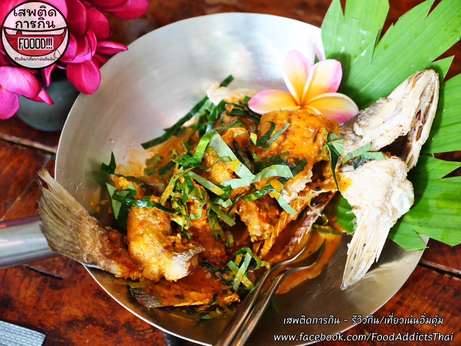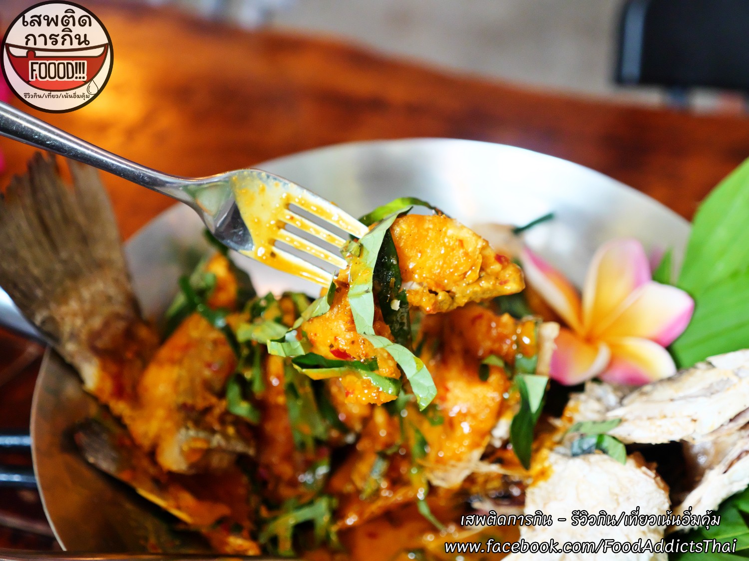 อาหารทุกอย่างที่เราสั่งไปมาเสิร์ฟแล้วครับ เรามีบทเรียนจากรอบที่แล้วนั่นก็คือพยายามสั่งอาหารที่มีรสชาติจัดจ้านเพื่อนำมาทานกับข้าวสวยฟรีของทางร้าน เมนูแรกที่เราสั่งมานั้นก็คือ ปลากะพงทอดทั้งตัวราดด้วยซอสแกงใบชะพลู ราคา 470 บาท ปลากะพงตัวใหญ่ทอดมาจนกรอบเนื้อในฉ่ำ ราดด้วยซอสแกงเข้มข้น ทานกับข้าวได้อีกหลายจาน เมนูถัดมาอาจจะดูธรรมดาไปสักหน่อยแต่แฟนผมอยากทาน นั่นก็คือกระเพราหมูสับไข่ดาว ราคา 250 บาท เป็นกระเพราหมูสับรสชาติเค็มหวาน ใส่ทั้งถั่วฟักยาว/ข้าวโพดอ่อน แต่สำหรับใครที่เป็นคนชอบกระเพราแบบโบราณอาจจะไม่ค่อยถูกใจนัก แต่แฟนผมชอบมาก ความหวานและกรอบของผักที่ใส่เพิ่มลงไปทำให้มีสัมผัสในการเคี้ยวมากกว่าเดิม บางคนอาจจะชอบกระเพราใส่เนื้อสัตว์แบบปกติ อันนี้ความชอบของใครของมันแล้วกันนะครับ
