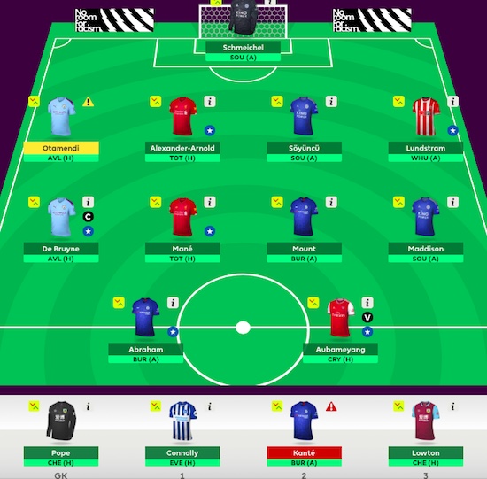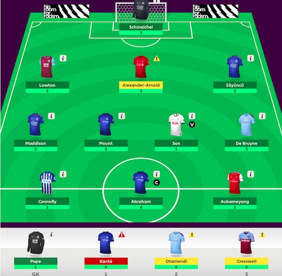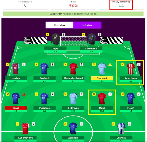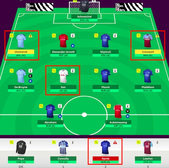 ด้วยงบประมาณที่เผื่อไว้จากวีคก่อน ทำให้สามารถใส่มาเน่ ลงมาแทนซนได้ ส่วนเครสเวลล์ก็ตัดสินใจถอดออก เพราะนอกจากจะไม่การันตีตัวจริง เวสต์แฮมก็เริ่มเสียประตูง่ายขึ้น