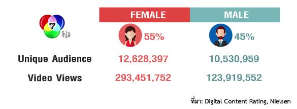 – ช่อง 7 มียอดรับชมเป็นจำนวนคน (แบบไม่นับซ้ำ หรือ Unique Audience) ในการรับชมเนื้อหารายการบนแพลตฟอร์มดิจิตอล ทั้งสิ้น 23,159,356 คน ซึ่งเพิ่มขึ้นจากเดือนก่อนหน้า (สิงหาคม 2562) ประมาณร้อยละ 13 โดยแบ่งเป็นการรับชมของเพศหญิงจำนวนร้อยละ 55 และเพศชายจำนวนร้อยละ 45 ของยอดรับชมเป็นจำนวนคน ทั้งนี้ ผู้รับชมเนื้อหารายการส่วนใหญ่อยู่ในช่วงอายุ 21-34 ปี