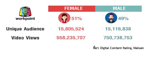 – ช่องเวิร์คพอยท์ ทีวี มียอดรับชมเป็นจำนวนคน (แบบไม่นับซ้ำ หรือ Unique Audience) ในการรับชมเนื้อหารายการบนแพลตฟอร์มดิจิตอลทั้งสิ้น 30,922,362 คน ซึ่งเพิ่มขึ้นจากเดือนก่อนหน้า (สิงหาคม 2562) ประมาณร้อยละ 2 โดยแบ่งเป็นการรับชมของเพศหญิงจำนวนร้อยละ 51 และเพศชายจำนวนร้อยละ 49 ของยอดรับชมเป็นจำนวนคน ทั้งนี้ ผู้รับชมเนื้อหารายการส่วนใหญ่อยู่ในช่วงอายุ 25-34 ปี