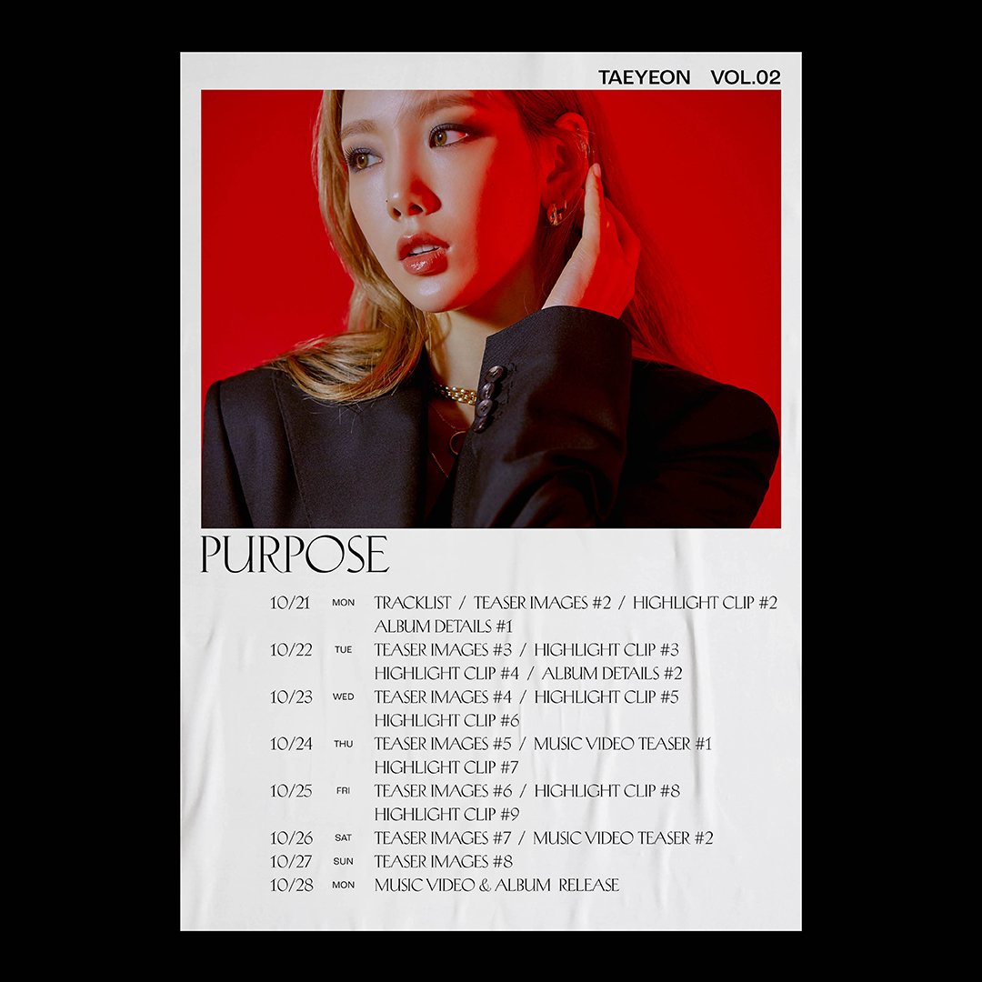โดย แทยอน จะปล่อยโซโล่อัลบั้มเต็มชุดที่ 2 ‘Purpose’ ออกมาในวันที่ 28 ตุลาคมนี้ (เป็นกำหนดใหม่ที่เลื่อนมาจากเดิมคือวันที่ 22 ตุลาคม เนื่องจากสถานการณ์ที่เกิดขึ้นก่อนหน้านี้)