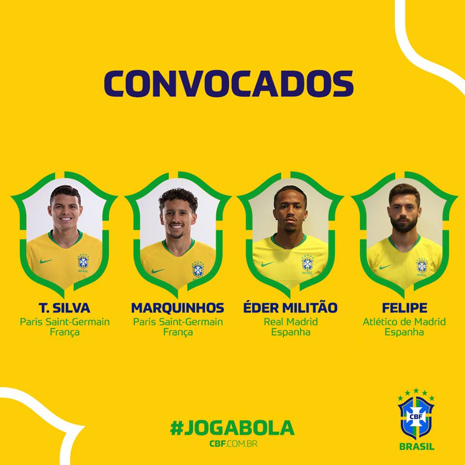 กองหลัง : ติอาโก้ ซิลวา (ปารีส แซงต์-แชร์กแมง / ฝรั่งเศส), มาร์กินญอส (ปารีส แซงต์-แชร์กแมง / ฝรั่งเศส), ดานิโล่ (ยูเวนตุส / อิตาลี), อเล็กซ์ ซานโดร (ยูเวนตุส / อิตาลี), เอแดร์ มิลิเตา (เรอัล มาดริด / สเปน), เรนัน โลดี้ (แอต. มาดริด / สเปน), เฟลิเป้ (แอต. มาดริด / สเปน), เอแมร์ซอน (เรอัล เบติส / สเปน)
