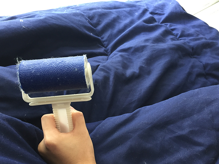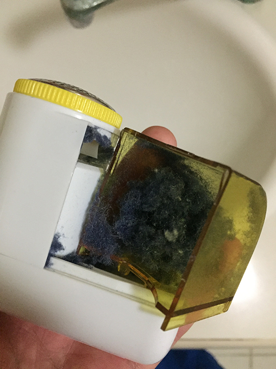 ระหว่างนั้น ผมใช้วิธีกำจัดขุยที่ว่า โดยมีดโกน, ลูกกลิ้งกำจัดขุย, เทปกาว และเครื่องตัดขุย