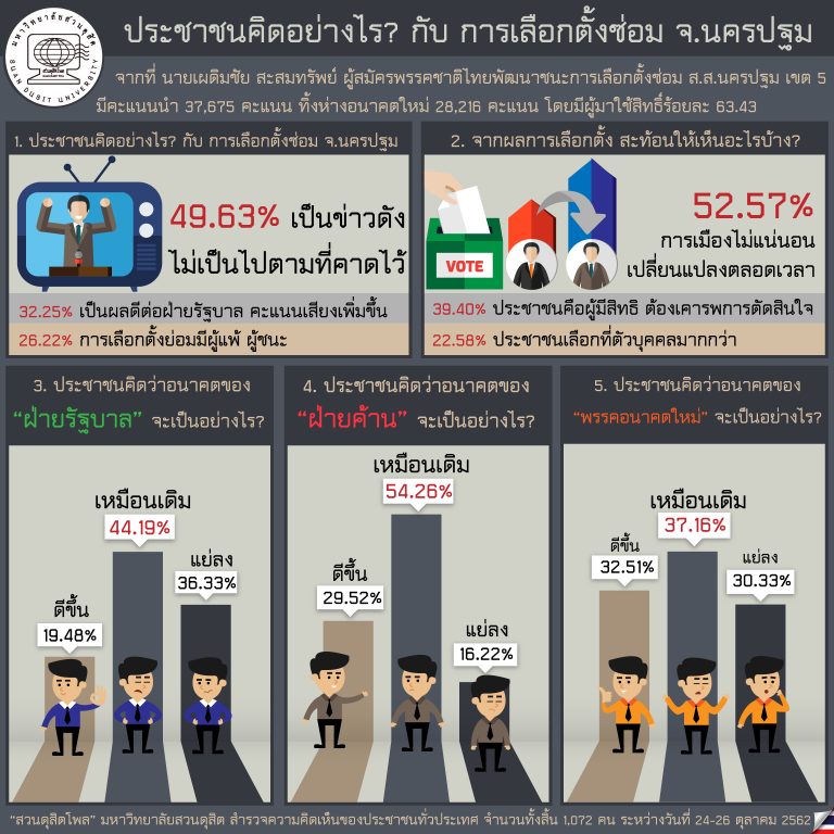“สวนดุสิตโพล” มหาวิทยาลัยสวนดุสิต สำรวจความคิดเห็นของประชาชนทั่วประเทศจำนวนทั้งสิ้น 1,072 คน เรื่อง “ประชาชนคิดอย่างไร กับ การเลือกตั้งซ่อม จ.นครปฐม” ระหว่างวันที่ 24-26 ตุลาคม 2562 เมื่อถามถึงประชาชนคิดเห็นอย่างไร กับ การเลือกตั้งซ่อม จ.นครปฐม พบว่า