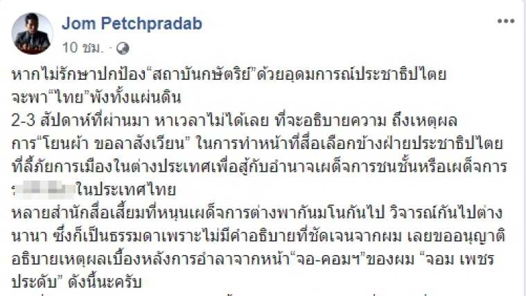 หลายสำนักสื่อเสี้ยมที่หนุนเผด็จการต่างพากันมโนกันไป วิจารณ์กันไปต่างนานา ซึ่งก็เป็นธรรมดาเพราะไม่มีคำอธิบายที่ชัดเจนจากผม เลยขออนุญาติอธิบายเหตุผลเบื้องหลังการอำลาจากหน้า“จอ-คอมฯ”ของผม “จอม เพชรประดับ” ดังนี้นะครับ