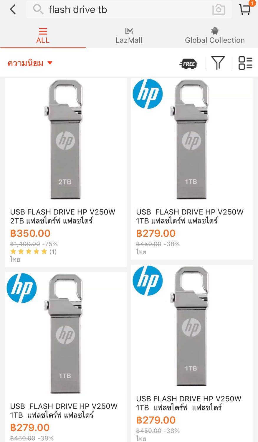 ไปดูใน Lazada มา External Hardisk 2 TB ของ WD ราคา 958 บาท กับ Flash Drive 2 TB ของ HP ราคา 119 บาท