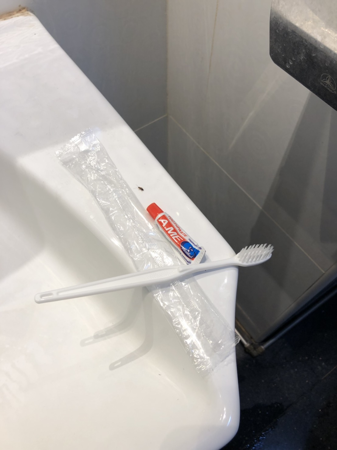 แฟนเปิดประตูห้องน้ำเข้าไป เจอขันพลาสติก เข้าใจว่าน่าจะเอาใว้ให้ตักน้ำกิน ส้วมเลอะเป็นจุดๆ พื้นห้องน้ำไม่สะอาด พื้นภายในห้องก็เก่าและไม่สะอาด