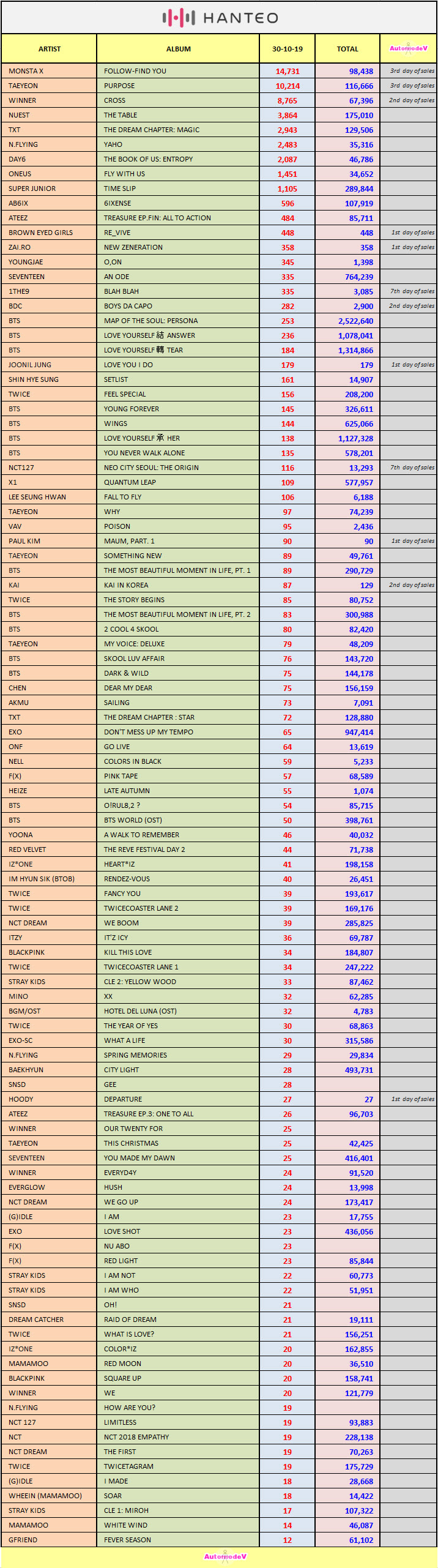 ยอดซื้ออัลบั้มจากชาร์ต HANTEO 30 ตุลาคม 2562