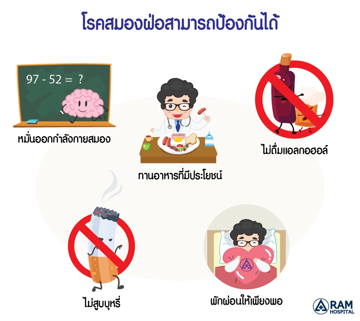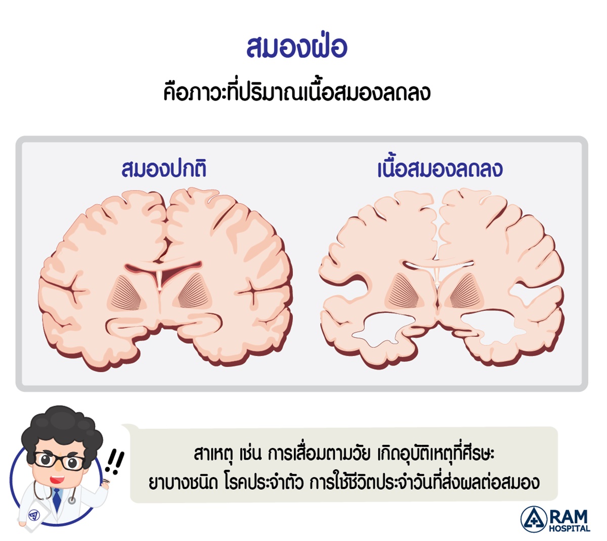 *** แม้ว่าร่างกายของเราจะเสื่อมไปตามกาลเวลาและไม่อาจป้องกันอาการสมองฝ่อได้อย่างเต็มที่ แต่การดูแลตัวเอง การใช้ชีวิตอย่างระมัดระวังและหลีกเลี่ยงปัจจัยเสี่ยงต่างๆ ที่เราสามารถป้องกันได้ ตลอดจนการเรียนรู้เพิ่มการจดจำที่ดีเพื่อให้สมองแข็งแรงขึ้น ก็จะช่วยป้องกันและชะลอความเสื่อมของสมองได้เป็นอย่างดีครับ