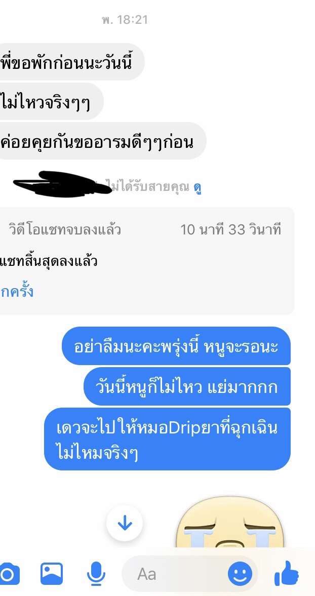 เราก็รอๆๆไม่โทรกลับมาเลย สัก 2 ทุ่มทักมาบอกว่า วันนี้แย่ ไม่ไหวจริงๆๆ ขอนอนพักนะ เราก็ตอบกลับไปว่าโอเคร
