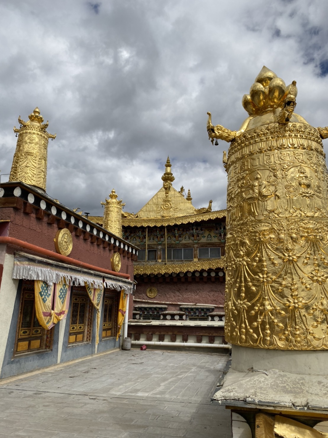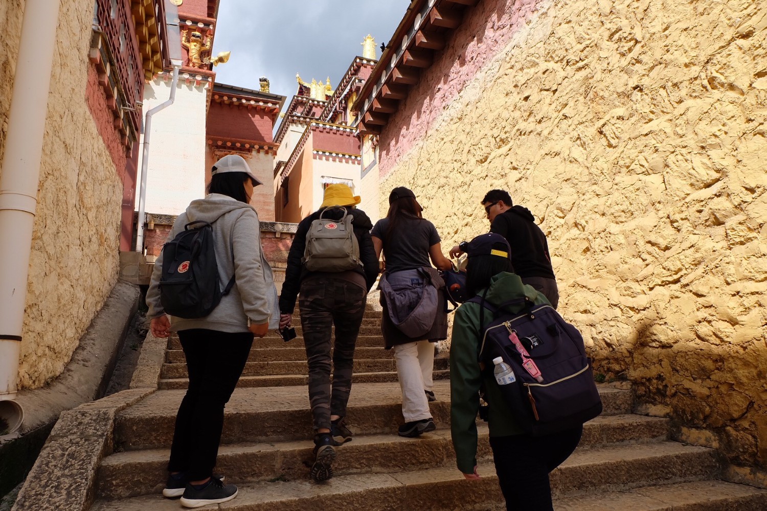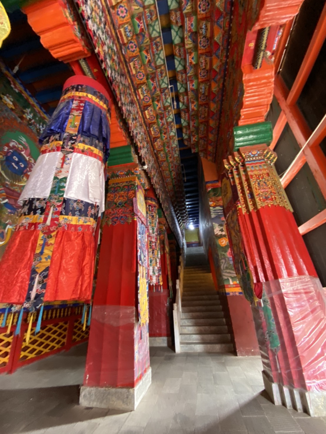 ด้านนอกของหอพระ ที่เดินขึ้นไปด้านบน สีสันสดใสตามสไตล์ฑิเบต ที่เป็นพุทธศาสนานิกายวัชรยาน