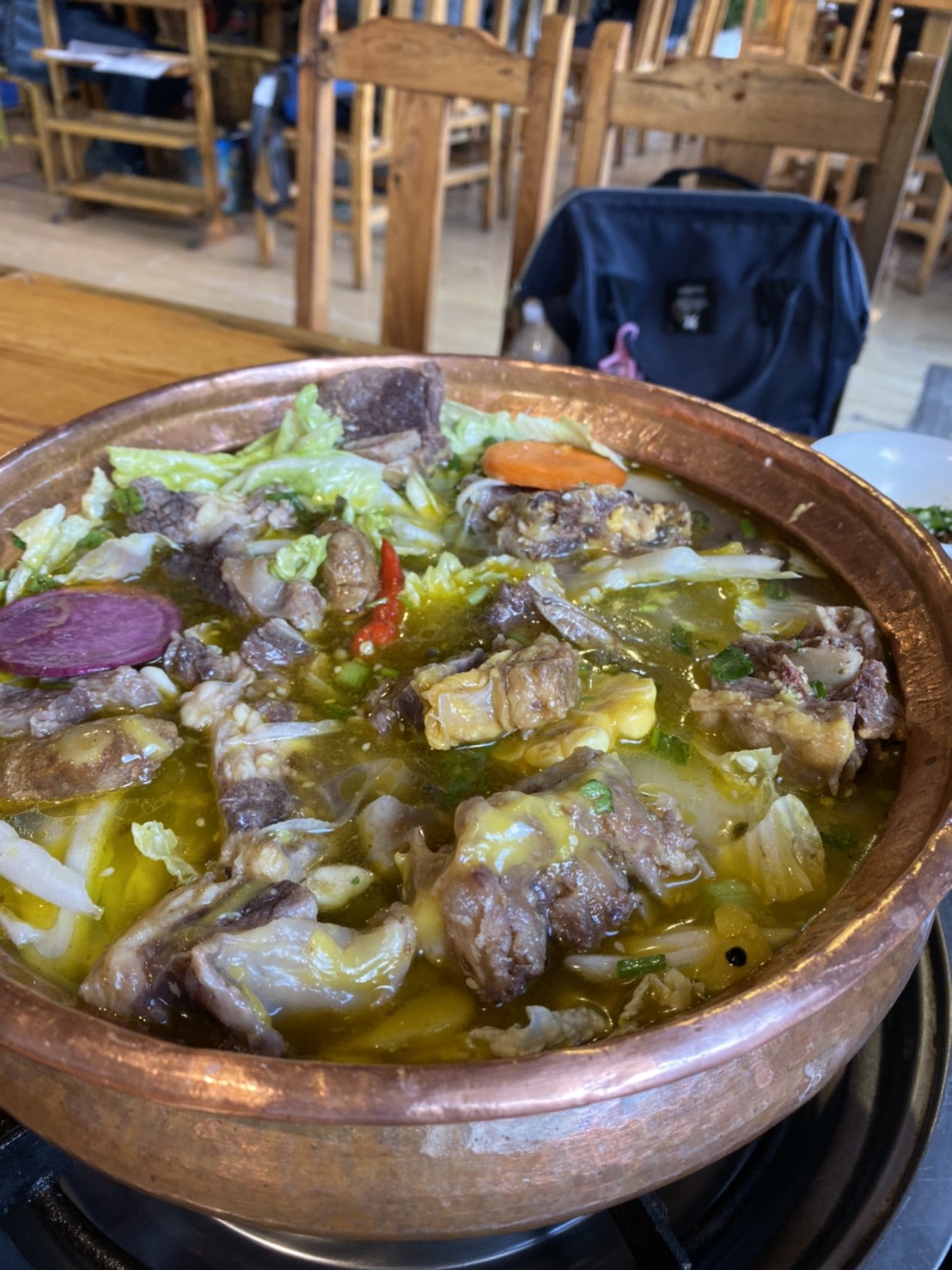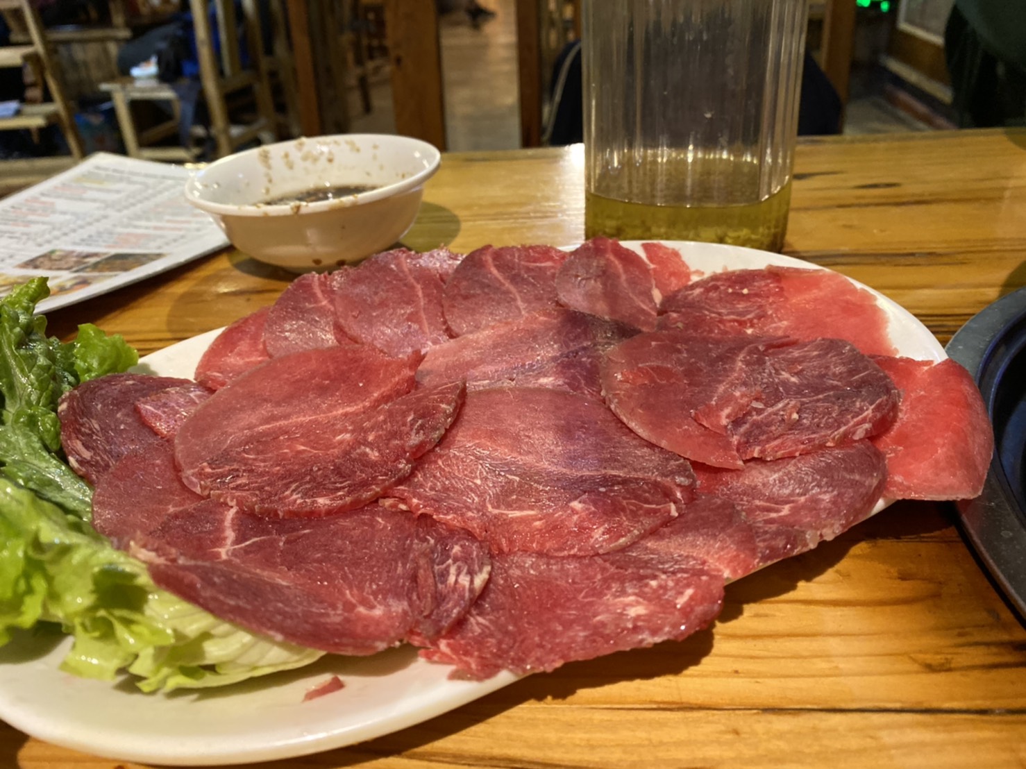 หม้อไฟเนื้อจามรี เค้าหั่นเป็นก้อนๆแล้วต้ม บางชิ้นติดเอ็นก็จะเหนียว น้ำซุปมีให้เลือก 2 แบบ ก็แบบปกติ กับแบบเปรี้ยว เราสั่งแบบเปรี้ยว สั่งขนาดกลาง ในราคา 158 CNY ต่อหม้อ แต่รู้สึกไม่ค่อยถูกปาก เพราะมันมาก ถ้าตักซุปมาในชามเราแล้วต้องรีบกิน เพราะรอซักพักมันจะขึ้นไข เพราะอากาศที่นี่เย็นมาก กินๆไปอยากได้เนื้อๆเน้นๆเลยสั่งเนื้อจามรีสไลด์มาเพิ่ม ในราคา 58 CNY ต่อจาน อันนี้ดีงาม (ตอนกลับมาจากย่าติง ถึงแชงแล้วไปเดินเล่นในเมืองเก่ากิน Hotpot & BBQ อร่อยเริ่ด เด๋วค่อยมาบอกชื่อร้านอีกที)