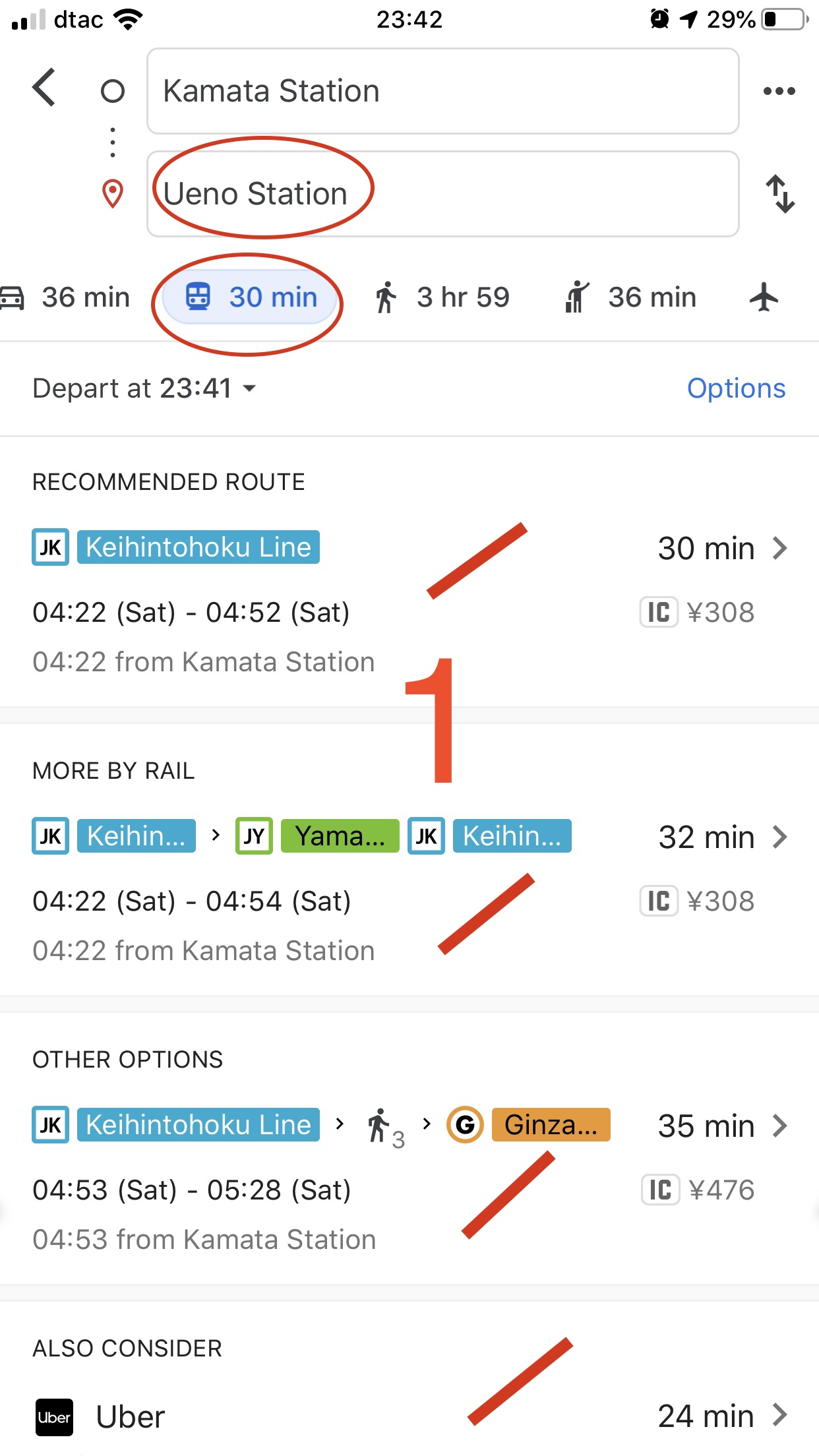 2.1 มันจะบอกระยะทางที่เราจะต้องเดินไปสถานีรถไฟที่เราเลือกว่าใช้เวลาเท่าไหร่ ห่างกี่เมตร เราสามารถเตะตรงวงกลมสีแดง2.1เพื่อให้เป็นGPSบอกเส้นทางเดินไปที่สถานีได้ด้วยนะ