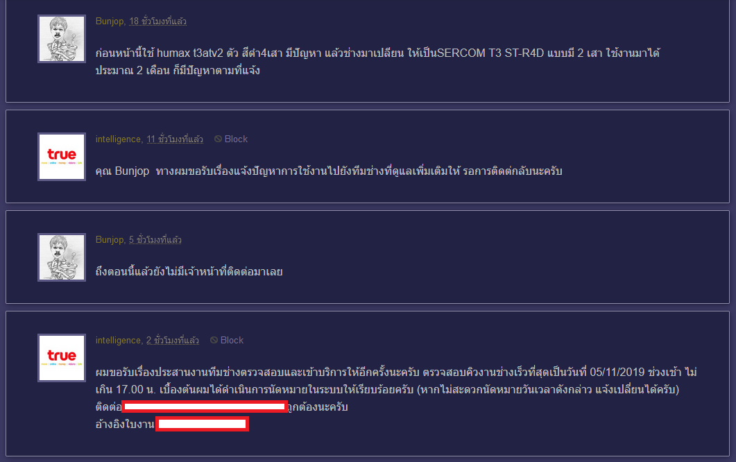 ของผมตัวเราเตอร์ทรูมีปัญหาซึ่งอุปกรณ์ของทรูที่ผมได้มี 2 ตัว มีตัว ONU ZTE F612C และตัว เราเตอร์ SERCOM T3 ST-R4D ซึ่งตอนนี้ตัวเราเตอร์ SERCOM T3 ST-R4D มีปัญหาเสียบสายแลนไฟไม่ติดไวไฟก็ไม่มีสัญญาณปล่อยออกมา ผมก็ได้ลองต่อสายแลนผ่านตัว ZTE F612C เน็ตก็ใช้งานได้ปกติ ก็ได้แจ้ง intelligence ไปทางหลังไมค์บอกอาการและบอกว่าได้ทำตามนี้แล้วตั้งแต่เมื่อวาน ได้รับคำตอบกลับมาว่า สัญญาณเน็ตปกติ ซึ่งในการแจ้งผมไม่ได้แจ้งว่าเน็ตมีปัญหาผมได้แจ้งว่าเราเตอร์ไม่จ่ายไอพี และวันนี้ผมได้รับคำตอบ ตรวจสอบคิวงานช่างเร็วที่สุดเป็นวันที่ 05/11/2019 ช่วงเช้า ไม่เกิน 17.00 น. รอกันนานมากนะครับ ดีนะครับที่ผมได้ไปหยิบยืมเราเตอร์ของน้องชายข้างบ้านมาใช้งานชั่วคราวในวันนี้ ผมต้องใช้งานตลอดนะครับในการรีโมทไปดูเครื่องต่างๆที่อยู่ต่างจังหวัด