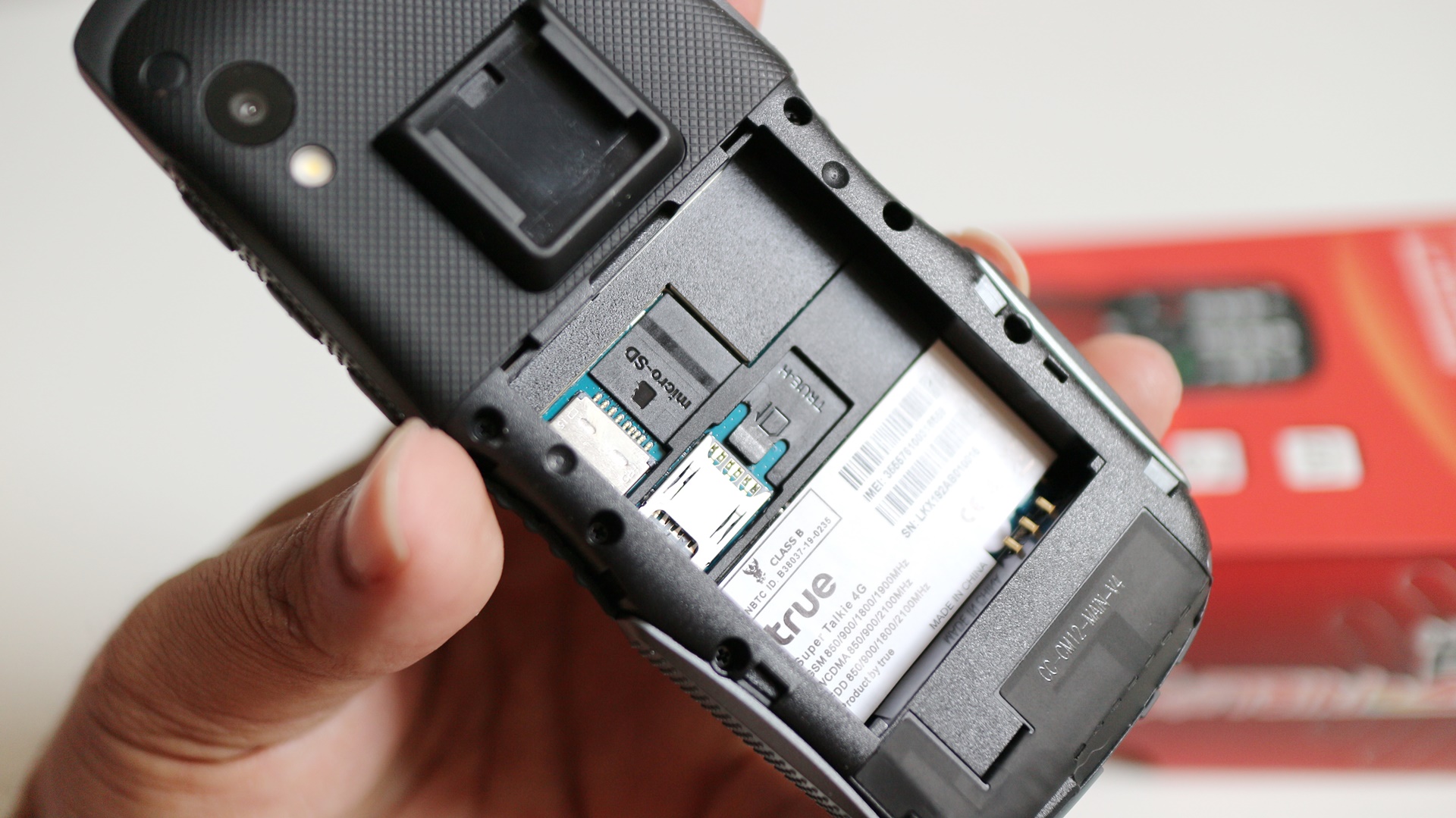 เมื่อแกะฝาหลังออกมาก็จะเจอช่องใส่แบตเตอรี่ ช่องใส่วิมการ์ดและช่องเพิ่มหน่วยความจำภยนอกแบบ microSD CARD
