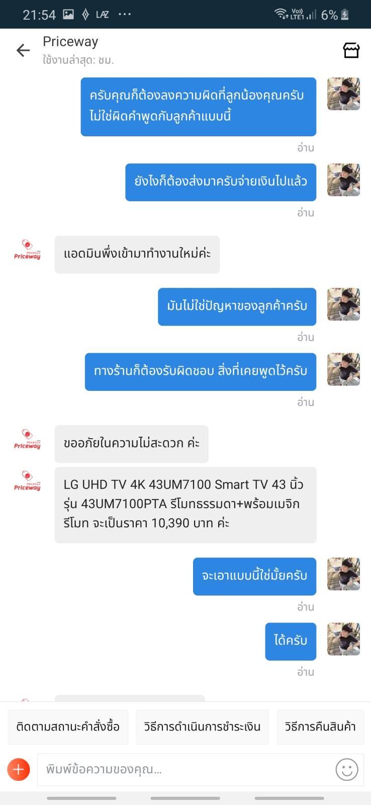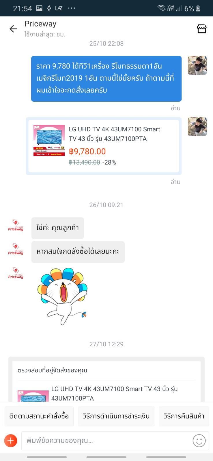 สั่งทีวีLG พร้อมเมจิครีโมท สอบถามทางร้านก่อนซื้อตกลงกันเรียบร้อย ว่ามีรีโมท2ตัว เป็นธรรมดา1 เมจิค1 พอส่งมามีแต่กล่องทีวี ไม่มีกล่องรีโมท แชทไปหาทางร้านทางร้านบอกจะส่งตามมาให้ แต่พออีกวันมาเปลี่ยนคำพูดไม่ส่งให้ซะงั้น พอบอกจะแจ้ง สคบ ก็บอกจะส่งมาให้ แต่ตอนหลังก็กลับคำพูดไม่ส่งมาให้อีก