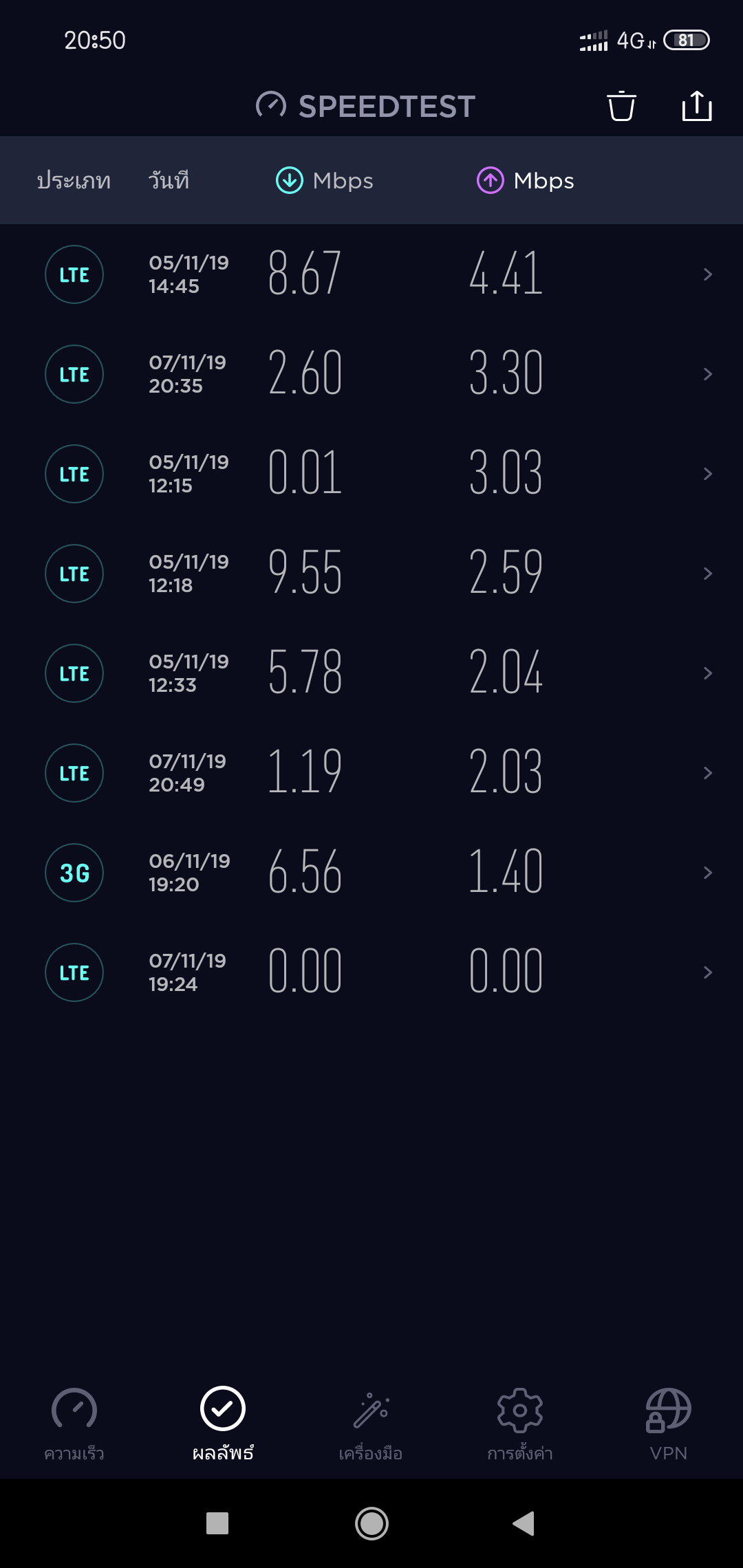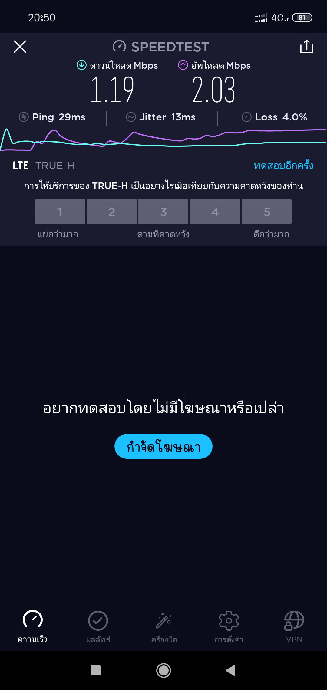 ก่อนหน้านี้ใช้ Nu Mobile โปรเน็ต 4 เมก ไม่ลดสปีด จ่าย 200 บาท/เดือน เช็คสปีดก็มาเต็ม 4 เมก ตลอด 3 ปลายๆ บ้างบางครั้ง พอทุกค่ายออกโปรใหม่มา เน็ต 10 เมก ไม่ลดสปีดจ่าย 200 บาท/เดือนเหมือนกัน ย้ายค่ายสิครับรออะไร ซึ่งก็มี True ค่ายเดียวที่ย้ายค่ายเบอร์เดิมมาใช้โปรนี้ได้ ส่วนค่ายอื่นต้องเปิดเบอร์ใหม่เท่านั้น (ข้อมูล ณ 7 วันที่แล้วก่อนจะย้ายค่าย) ผมย้ายค่ายสำเร็จวันจันทร์ที่ 4 พ.ย. 62 ก็จัดการเติมเงินเพื่อสมัครโปรเน็ต 10 เมก แต่พอใช้งานแล้วความรู้สึกทำไมมันไม่ได้เร็วกว่าเน็ต 4 เมกที่เคยใช้เลย พอลองเช็คสปีดก็ได้ตามภาพปลากรอบ เน็ต True แกว่งมาก พื้นที่ที่ผมใช้งานอยู่ จ.ระยอง ที่บ้าน ต.บ้านค่าย ที่ทำงาน ต.ตะพง กลางเมืองระยองเองเน็ตก็มาไม่ถึง 10 เมก ล่าสุดตอนนี้เช็คสปีดที่บ้านได้ความเร็วแค่ 1 เมก ทำไมเน็ต 4G True ที่โฆษณาว่าแรงที่สุดถึงเต่าจังเลยครับ