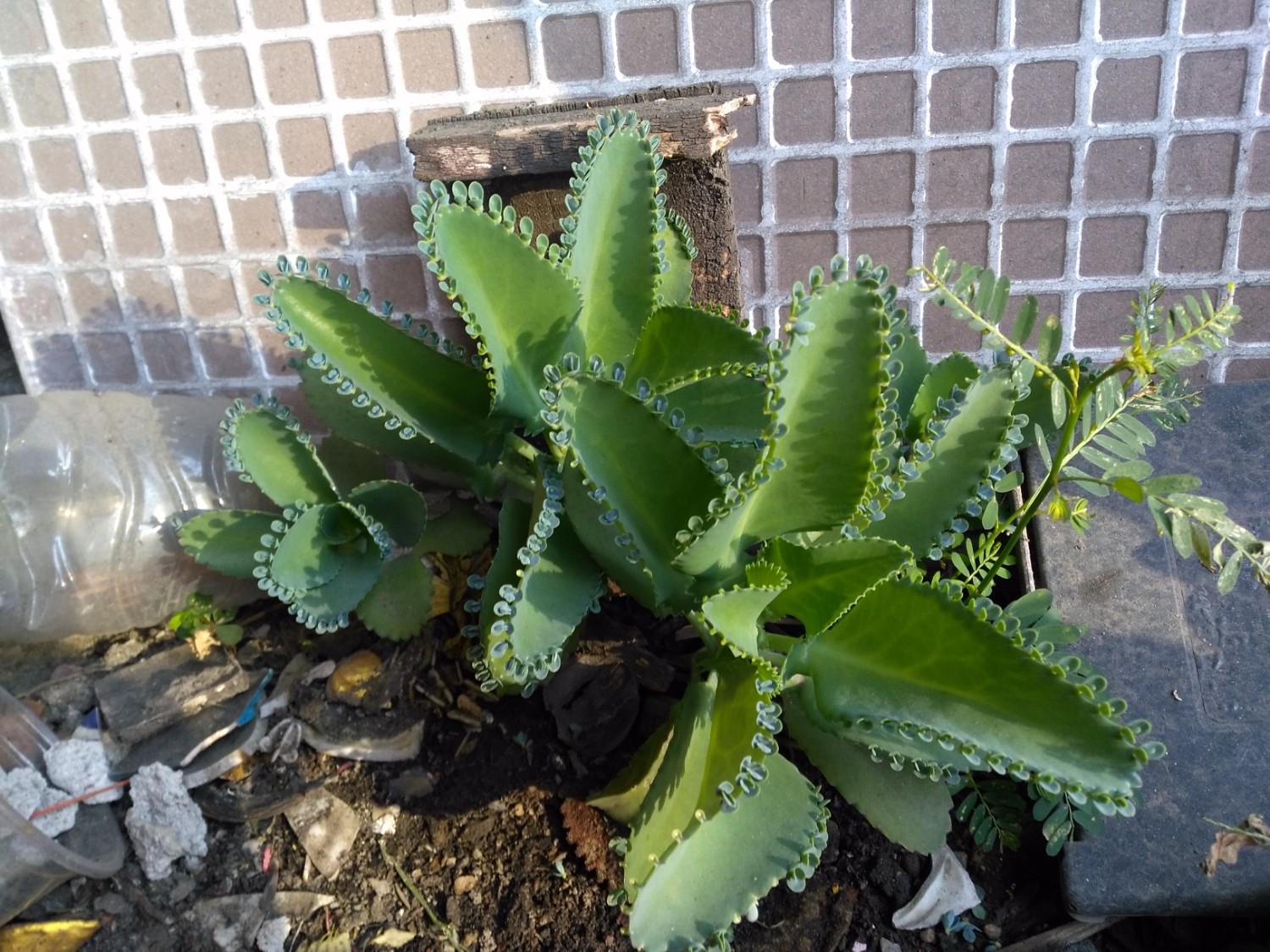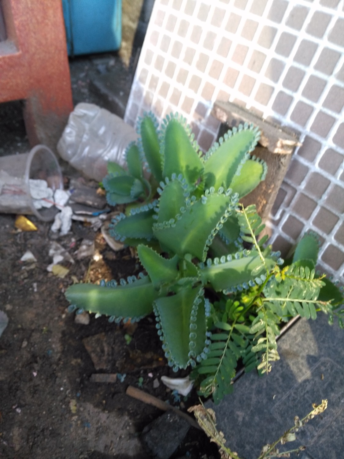 พบเธออยู่ในท่อ PVC บนหลังคาตึกซึ่งก็มีน้ำท่วมขังนิดหน่อย จึงเอาเธอลงมาไว้บนดิน เธอก็งอกงามสวยดีแต่ไม่รู้จักชื่อเธอค่ะ พยายามค้นจาก Google แล้วก็ยังไม่ตรงกับภาพเลย รบกวนด้วยนะคะ