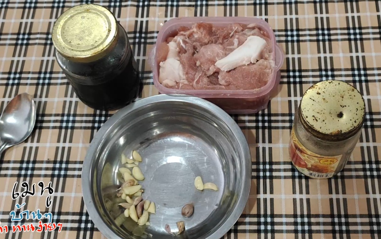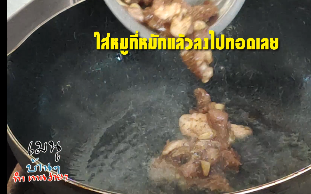 1.ตั้งกระทะใส่น้ำมัน นำหมูที่หมักแล้วลงไปทอดจนสุก ตักราดบนข้า