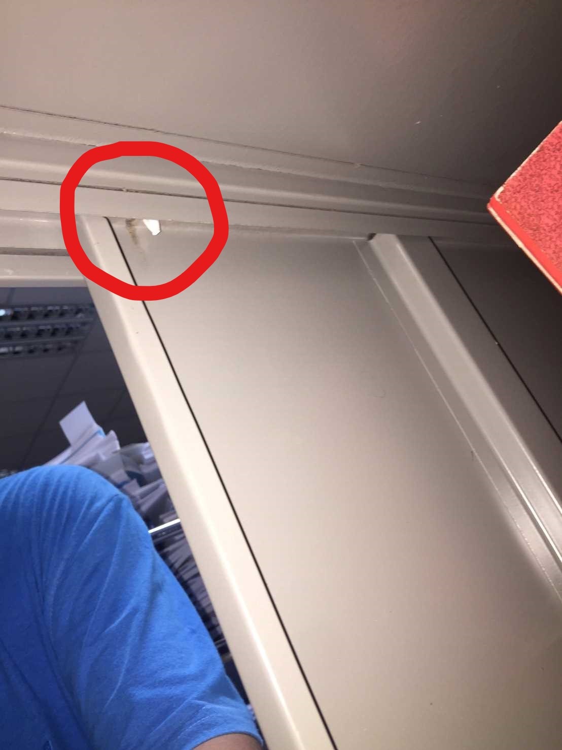 สวัสดีครับ ตู้บานเลื่อนเหล็ก ติดเดือยล็อคด้านบนทำให้บานเลื่อน เลื่อนไม่ได้ จะถอดเจ้าหมุดในรูปสีขาวออกได้อย่างไรครับ